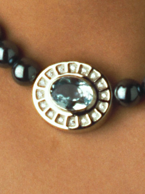 On this page I present a necklace of 14K white gold with an 11ct. aquamarine. Also inset are 0.80ct. of Russian diamonds. The necklace is supported by hematite beads. A removable section allows the necklace to be worn as a choker: