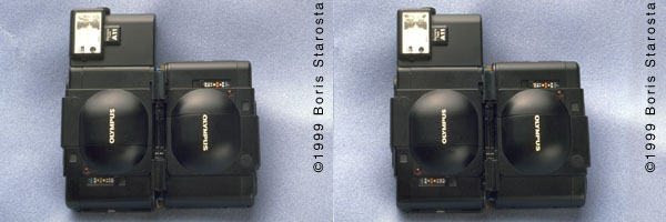 Figure 1. Cross-eyed stereo pair of the Olympus XAx2 with flash attached to master camera.