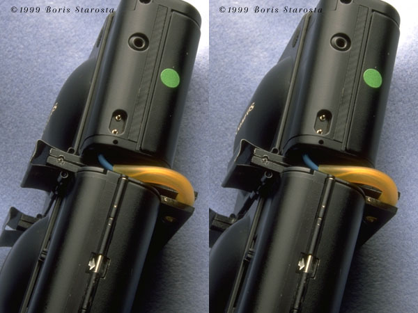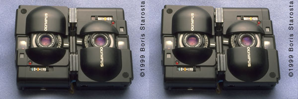This camera is an early 1999 project. It enables me to shoot full frame 35mm stereo pairs with a compact handheld camera. The Olympus XA is well suited to twin rig stereo for several reasons. It is semi automatic aperture priority, allowing manual control of depth of field, with one camera doing the metering and firing both shutters electrically. I have found flash sync to be excellent, automatic metering to be very good. Pictures of my studio setup were taken with this camera.