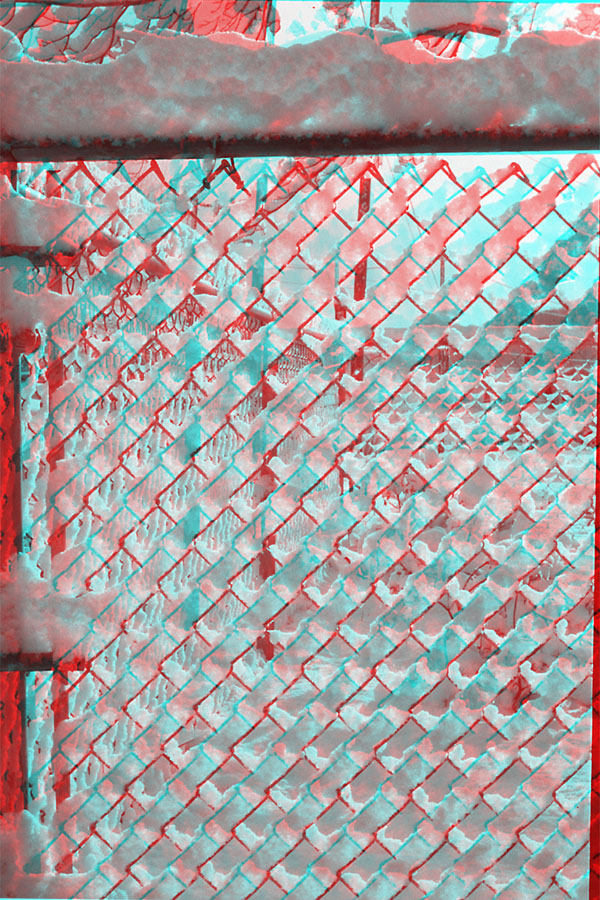 Maybe this very curious discovery will save some of you from wasting film shooting through chain link fences, or other horizontally rythmic screens. I imagine any kind of picket or iron grate fence would cause similar problems, as would shooting through rythmic patterns in sheer fabric. The key is to avoid rythmic screens that are regular in the horizontal axis, which is used by the brain for analysing stereo disparity. Then again, it makes an interesting subject for experimentation