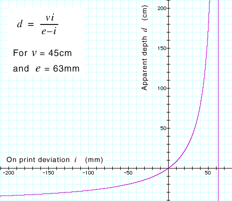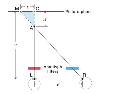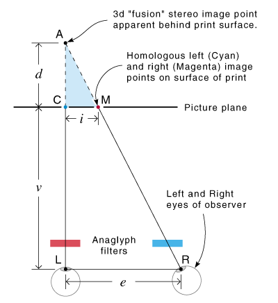 Anaglyph prints produce a true three dimensional image, whose components occupy points in the space behind or in front of the print. The distance from these points to the surface of the print is called the apparent depth. The apparent depth d is a function of three variables. They are the deviation i of homologous points on the page, your interpupillary separation e, and your viewing distance v from the page: