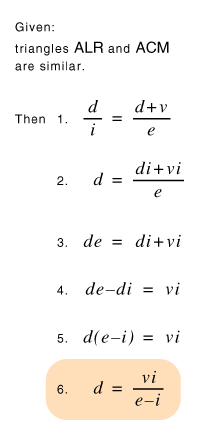 One thing that makes the viewing of anaglyphs interesting is that the viewing distance v can be changed dynamically, and this changes the apparent depth of the image. The function works for calculating the depth of points in front of or behind the print surface. Points in front of the print have a negative deviation, and result in a negative value for d. For those readers longing back to the good old days of high school algebra, I provide the derivation of the function below. |