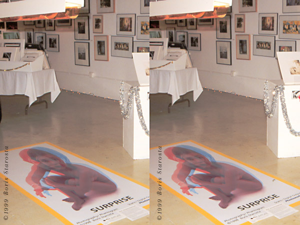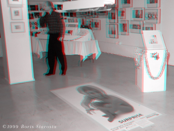 Shooting SURPRISE is a self-referential strange logic loop, as it shows somewhat humorously a studio setting, in which I am shooting the very pose that is presented in the print - I am shooting the print, which shows the image that was shot in the studio in order to make the print. (I admit that I am a fan of M.C. Escher.)SURPRISE is an inkjet print about 3 x 7 feet in size. It is designed to be viewed at an oblique angle: you stand at one end, with the print stretching away from you resting on the floor. Figure2. Downtown Artspace shows the print installed at the Charlottesville art gallery of the same name. There is a "sweet spot," from which point the three dimensional image can be viewed without distortion - and with surprising realism. In the gallery this spot was marked with an X on the floor and an anaglyph viewer hanging from the ceiling. Figure 1. Shooting SURPRISE was taken from this sweet spot, and gives you a small taste of how the print and its 3-d image appear in real life. I do not know that another print like this has ever been made: a life-size human figure presented as a phantogram. Quite possibly this print is absolutely unique in the world.