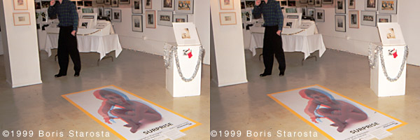 Figure 1. Shooting SURPRISE shows a floor-mounted print commonly called a phantogram, more technically an anaglyphic stereoanamorphograph. However, one can hardly say "commonly" as this type of print is unusual: I've seen small phantograms in technical books on 3-d geometry/mathematics, and they may occasionally show up in books about stereo imaging. Reel-3D sells a book on how to draw phantograms, although I've not read it. My interest in this stereo format was rekindled when I saw a phantogram by Achim Bahr printed on the cover of a recent issue of STEREOSCOPY magazine, the official journal of the International Stereoscopic Union.