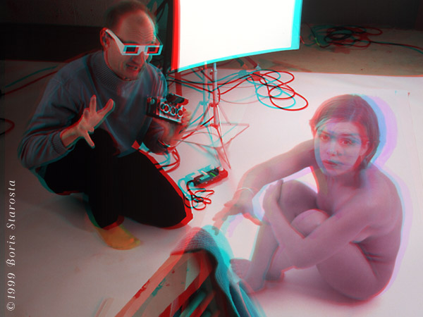 The phantogram image was created from a standard photographic stereo pair image using digital manipulation. The most complex part of this manipulation is the distortion: It has to be a perfect progressive perspective distortion, and cannot be done just using a 2-d perspective tool, such as the one in photoshop.I shot the model with my 35mm twin camera rig, in a very standard fashion (slide #3. Brandi 720). I then scanned the slides (drum scanner) to high resolution files, and took these scans into my favorite "3-d" software - Bryce. There I used the scans as "gels" within light sources that projected the image back down onto a virtual "floor." This projected image I rendered as the print. The geometry was very important, and I had taken careful notes and measurements during the photo session, so as to be able to recreate the geometric relationships of object / camera / and floor (print) with great precision within my computer model.